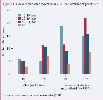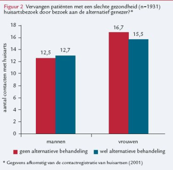 Een op de acht Nederlanders met een slechte gezondheid gaat naar een alternatief genezer. Opvallend is dat het bezoeken van het alternatieve circuit niet het huisartsbezoek vervangt, maar een aanvulling daarop lijkt te zijn. Bijna 1,1 miljoen Nederlanders (6,8%) bezocht in 2001 een alternatief…