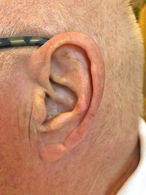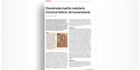 Chondrodermatitis nodularis chronica helicis (CNCH) is een goedaardige, maar hinderlijke inflammatoire druknodulus, die zich vrijwel altijd op de oorschelp bevindt waarop de patiënt ’s nachts het liefst ligt. De diagnose wordt meestal klinisch gesteld bij mannen tussen de 45 en 75 jaar op basis van de typische lokalisatie op de helix (of antihelix) en de kenmerkende gevoeligheid bij aanraking. Behandeling van CNCH vormt een uitdaging: niet alleen doordat ze geregeld recidiveert, maar ook omdat de bewijsvoering voor de verschillende behandelopties beperkt is.