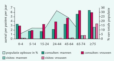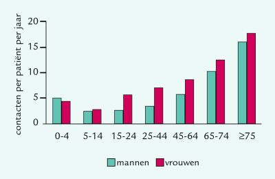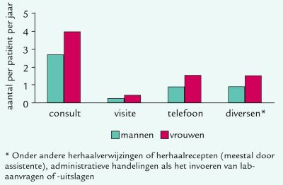 Patiënten hadden in 2000 gemiddeld 6,2 contacten met hun huisartspraktijk, in de vorm van consulten, visites, telefonische contacten met huisarts of assistente en werkzaamheden samengevat onder de categorie ‘diversen’. Er zijn grote verschillen tussen ouderen en jongeren, mannen en vrouwen, en…