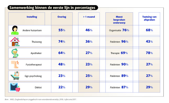 Huisartsen zweven niet in het luchtledige, ze zijn afhankelijk van anderen in de zorg en maatschappij. Een van de motieven om de kernwaarden te herijken is immers de veranderde maatschappij en het gewijzigde zorglandschap. Hoe werken huisartsen met elkaar en anderen samen? Moeten huisartsen nog meer samenwerken? Moeten ze dat in grote sociaal-medische teams doen? Hoe werken ze met de tweede lijn samen?