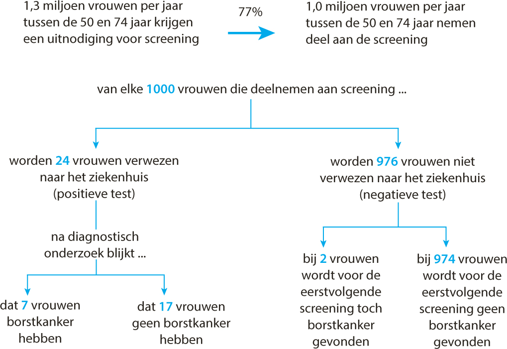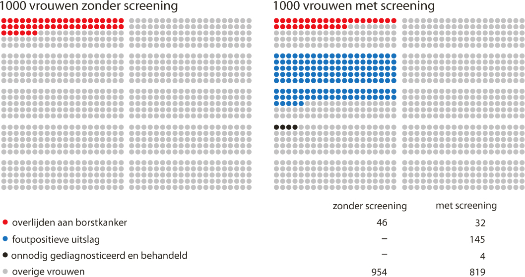 Het bevolkingsonderzoek borstkanker voorkomt jaarlijks 850 borstkankerdoden doordat de ziekte in een vroeg stadium ontdekt en behandeld wordt. Tegenover zeven ontdekte mammacarcinomen per duizend deelnemers staan echter zeventien foutpositieve uitslagen. Iedere vrouw die een uitnodiging ontvangt, weegt zelf de voordelen van deelname af tegen de nadelen.