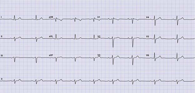 Het ecg van deze patiënt ziet er als volgt uit: Beschrijf het ecg systematisch volgens ECG-10+. Wat is uw beleid?
