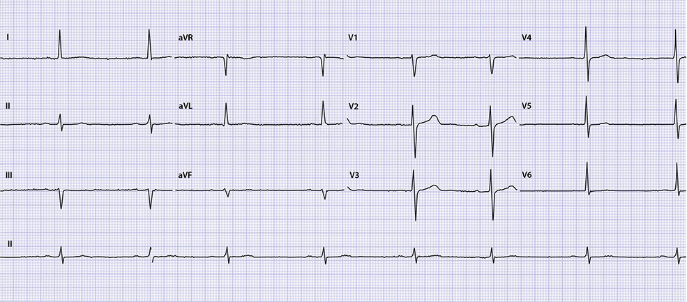 Frequentie en regelmaat | De frequentie is te traag (bradycardie): 48 slagen/min. Het interval tussen twee opeenvolgende QRS-complexen varieert. Het ritme is dus irregulair. As | Afleiding I is het meest positief (0°). Afleiding avF is het meest iso-elektrisch. De…