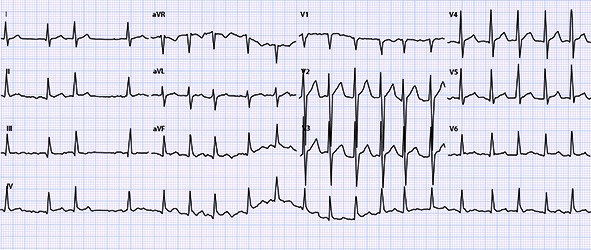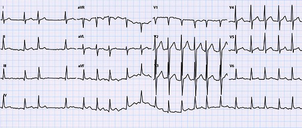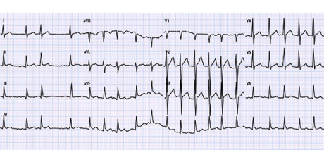 Het ecg van deze patiënt ziet er als volgt uit: Beschrijf het ecg volgens ECG-10+ , stel de diagnose in de conclusie en doe een beleidsvoorstel.