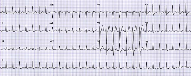 Het ecg van deze patiënt ziet er als volgt uit: De huisarts instrueert haar bij een recidief meteen te komen voor een ECG. Mocht dit niet tot een diagnose leiden, overweegt de huisarts een eventrecorder te regelen. Vijf dagen later meldt ze zich tussendoor…