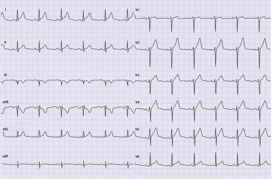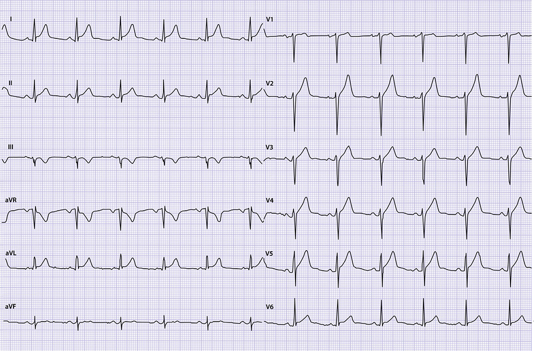 Mede op verzoek van de patiënt volgt er ‘ter geruststelling’ een ecg. De automatische interpretatie vermeldt een ‘acuut lateraal myocardinfarct’. Beschrijf het ecg systematisch volgens ECG 10+ . , Wat is uw verdere beleid? Is er inderdaad een infarctbeeld?