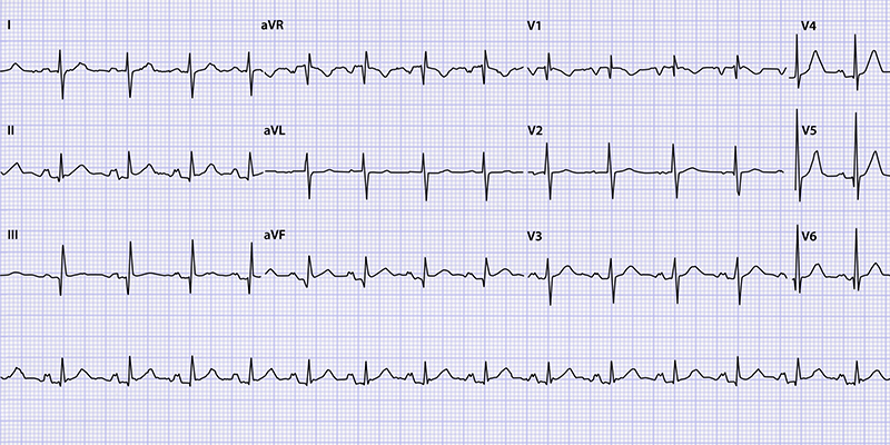Frequentie & regelmaat | met 102/min is de frequentie wat gedaald ten opzichte van de frequentie bij lichamelijk onderzoek. Regelmatig. As | Sterkst positieve afleiding is afleiding II (past bij een as van +60 graden), meest iso-elektrisch zijn afleiding I (past bij een as van +90…