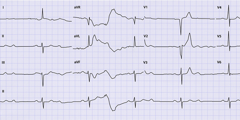 De huisarts denkt aan pneumonie, het direct bepaalde CRP is 5 mg/l. Verder maakt de huisarts een ecg vanwege de bradycardie. Beschrijf het ecg systematisch volgens ECG-10+. , Hoe luidt uw diagnose en welk beleid stelt u voor? ➤ Het antwoord vindt u hier .