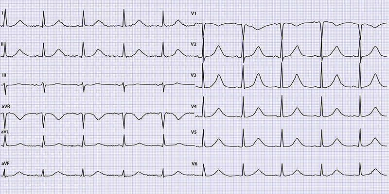De huisarts maakt het volgende ecg. Beschrijf het ecg systematisch volgens ECG-10+. Hoe luidt uw diagnose en welk beleid stelt u voor?