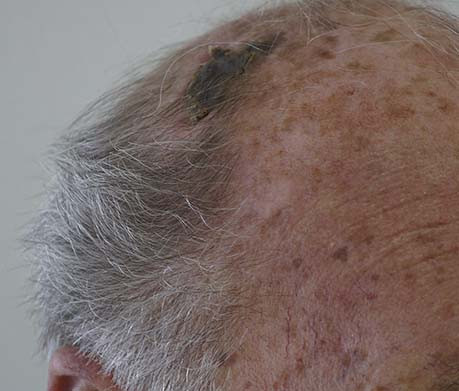 Een 78-jarige man is door de reumatoloog verwezen naar de polikliniek dermatologie vanwege een huidafwijking op zijn kruin. De plek op de kruin bestaat nu bijna een jaar en is een paar maanden geleden pijn gaan doen en opengegaan. Patiënt heeft nooit eerder huidklachten gehad…