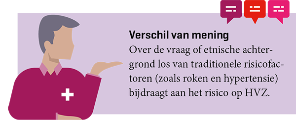 Etnische minderheden worden disproportioneel getroffen door hart- en vaatziekten. Wij vroegen in een serie interviews aan huisartsen welke invloed etniciteit heeft op het cardiovasculair risicomanagement. De meningen liepen uiteen over de vraag of etnische achtergrond los van traditionele risicofactoren bijdraagt aan het cardiovasculair risico. Wel erkenden de huisartsen dat de etnische achtergrond extra aandacht vraagt, zowel bij de risicoschatting als bij de leefstijlbegeleiding. Ze noemden een aantal best practices, maar laagdrempelige beschikbaarheid van telefonische tolkdiensten en meer nascholing over cultuursensitieve zorg zijn zeer welkom.