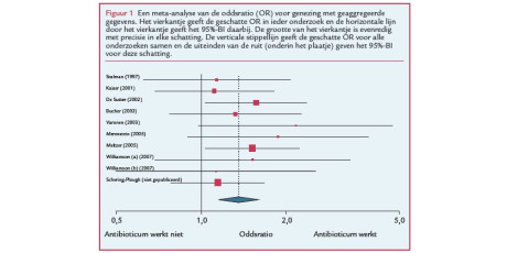 Antibiotica wordt nog vaak voorgeschreven bij acute rinosinusitis, hoewel een virus de oorzaak kan zijn en het beloop vaak spontaan en ongecompliceerd is. Een recente Cochrane-review bevestigt nogmaals dat gebruik van antibiotica bij acute rinosinusitis weinig effect heeft en niet opweegt tegen het risico op bijwerkingen.