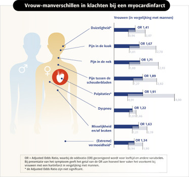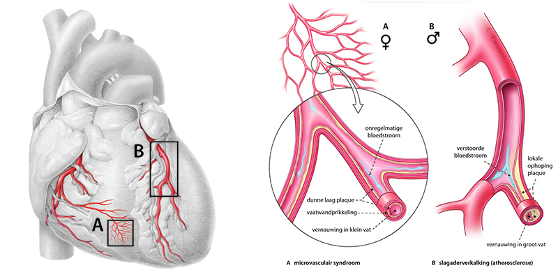 Een obstructie door atherosclerose in de coronaire vaten veroorzaakt zowel bij mannen als bij vrouwen de kenmerkende klachten van een myocardinfarct. Bij vrouwen heeft coronaire atherosclerose echter vaker dan bij mannen een niet-obstructief karakter. Dit andere patroon van atherosclerose leidt tot andere klachten, die niet altijd herkend worden.
