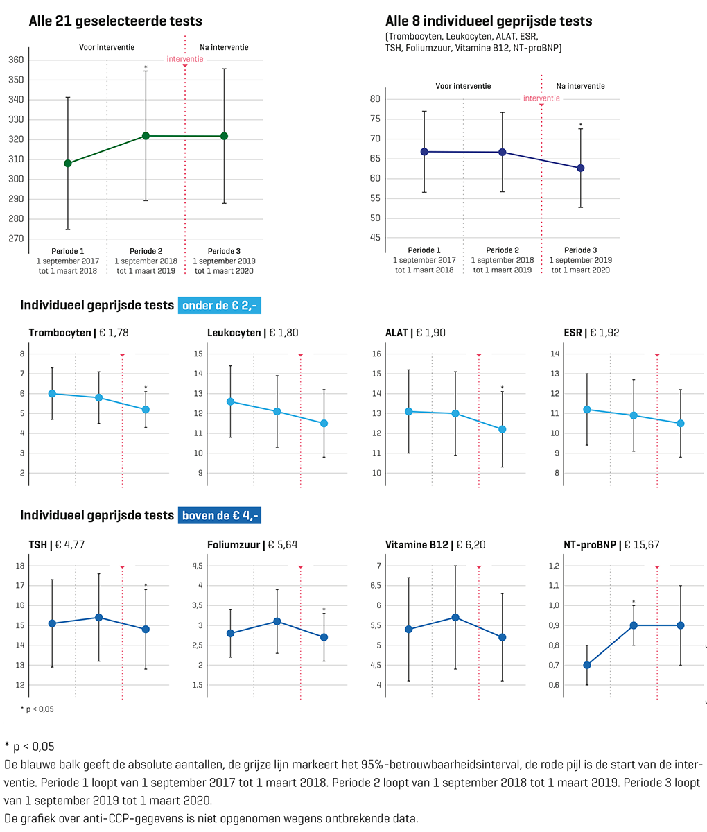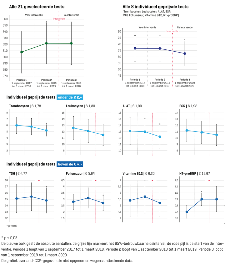 Omdat huisartsen steeds meer diagnostiek aanvragen, is zinnig en efficiënt aanvraaggedrag een speerpunt van beleid. Wij onderzochten voor 22 laboratoriumtests of huisartsen minder geneigd waren die test aan te vragen als ze de prijs in beeld kregen. Het totaal aantal aangevraagde tests daalde niet significant, maar het aantal laboratoriumbepalingen die afzonderlijk geprijsd waren, daalde met 6,1%. Dat maakt het aannemelijk dat het zichtbaar beprijzen van laboratoriumkosten wel enig effect heeft op het aanvraaggedrag.
