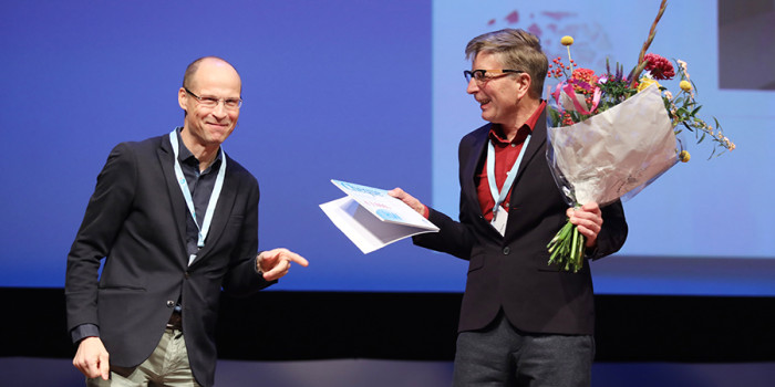 Het artikel ‘Nifedipine helpt niet bij chronische perniones’ van Ibo Souwer en collega’s won de Heert Dokterprijs 2018 voor het beste onderzoeksartikel van het afgelopen jaar in Huisarts en Wetenschap. Hans Uijen, lid van de selectiecommissie, reikte de Heert Dokterprijs uit aan een blije Souwer tijdens het NHG-congres in Den Haag op 9 november 2018.
