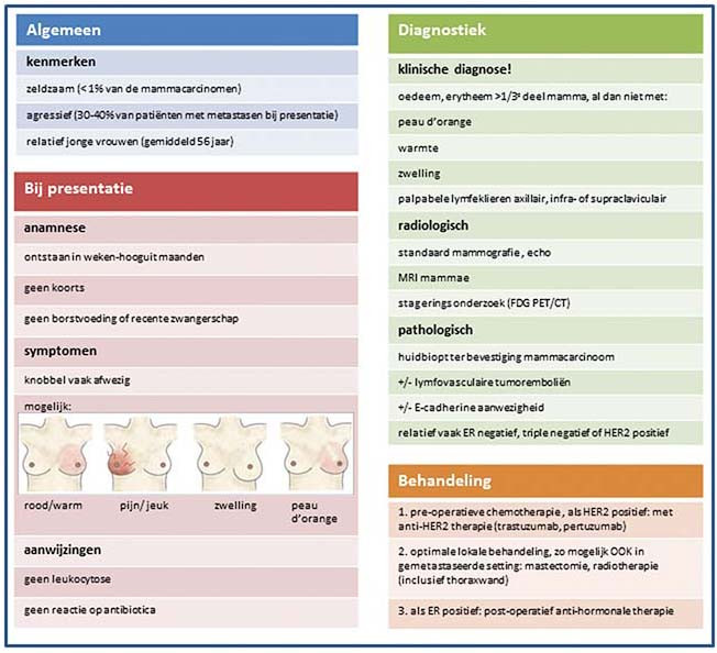 Inflammatoir mammacarcinoom is een zeldzame vorm van borstkanker. Een agressief beloop met korte anamnese, bij relatief jonge patiënten, en aanwijzingen bij anamnese en lichamelijk onderzoek, kunnen helpen…
