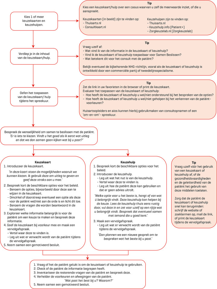 Samen beslissen neemt een belangrijke plaats in binnen de kernwaarden van de huisartsenzorg. Het proces van samen beslissen kan worden ondersteund door het gebruik van keuzekaarten en keuzehulpen. Er verschijnen steeds meer keuzekaarten en keuzehulpen, maar nog niet alle huisartsen weten hoe ze deze kunnen gebruiken. We laten zien hoe aios en huisartsopleider dit samen kunnen leren. Daarnaast geven we concrete tips voor het (leren) gebruiken van keuzekaarten en keuzehulpen.