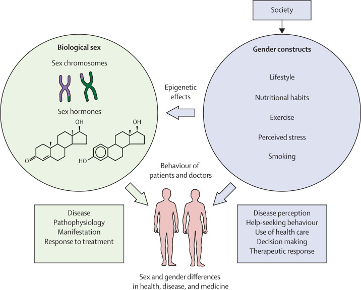 Tussen sekse en gender bestaan onderlinge interacties. Een bio-psychosociaal perspectief op ziekte en gezondheid geeft inhoud aan die interacties. Zowel een biologische factor (sekse) als een psychosociale factor (gender) dragen bij aan die vrouw-manverschillen (figuur).5
