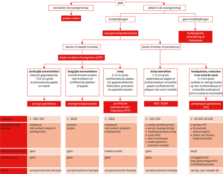 De meeste huidaandoeningen die leiden tot jeuk tijdens de zwangerschap zijn onschuldig, maar cholestase en pemphigoid gestationis brengen risico’s met zich mee. Bij cholestase is er jeuk zonder huidafwijkingen en zijn gal- en leverwaarden verhoogd, bij pemphigoid gestationis ontstaan in en rond de navel vesikels en bullae. Bij beide is verwijzing naar de tweede lijn geïndiceerd. Andere jeukende huidafwijkingen, zoals prurigo gestationis, zwangerschapseczeem, pruritische zwangerschapsfolliculitis en PEP/PUPPP, kunnen worden behandeld met indifferente zalf, topicale corticosteroïden of antihistaminica.