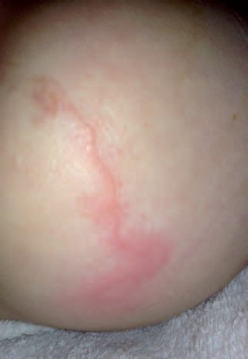 Als huisarts (AU) zag ik bij mijn 2-jarige zoontje een streepvormige afwijking van 1 cm lengte op zijn linkerbil. Ik dacht in eerste instantie aan een kras, totdat vier dagen later de streep was gegroeid tot 10 cm [foto ]. Hij was niet ziek, had geen koorts en leek er geen pijn of jeuk aan…