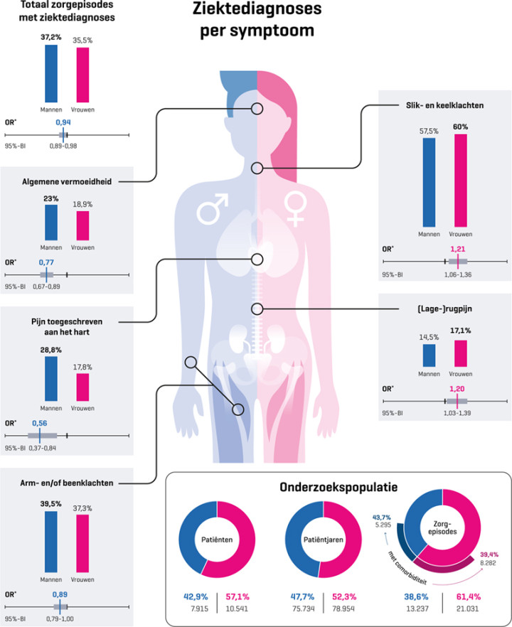 Het was al bekend dat het diagnostische traject voor mannen en vrouwen bij diverse aandoeningen verschilt. Nu is uitgezocht of er ook man-vrouwverschillen zijn in de diagnostische onderzoeken die de huisarts uitvoert bij veelvoorkomende lichamelijke klachten, en of die verschillen invloed hebben op de diagnose. Dat blijkt inderdaad het geval: vrouwen krijgen minder vaak lichamelijk of beeldvormend onderzoek, of een verwijzing naar de specialist. Ze krijgen wel vaker laboratoriumonderzoek, maar uiteindelijk minder vaak een ziektediagnose. Het is belangrijk dat huisartsen zich ervan bewust zijn dat zulke verschillen kunnen leiden tot verschillende zorguitkomsten.