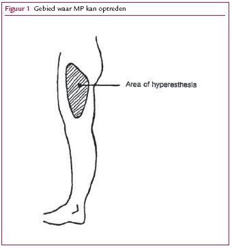 Meralgia paraesthetica (MP) is een syndroom met verschijnselen van pijn met een prikkelend, brandend karakter en soms met gevoelloosheid in een nauwkeurig aangegeven gebied aan de voor- en zijkant van het bovenbeen. MP is een vrij zeldzame aandoening, het incidentiecijfer is 4,3 per 10.000…