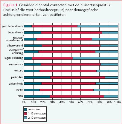 Ongeveer 20% van alle Nederlanders heeft in een jaar geen enkele keer contact met de huisartsenpraktijk, ook niet voor een herhaalrecept; eveneens 20% heeft 10 keer of vaker contact en voor de overige 60% is de jaarlijkse frequentie 1 tot 10 keer. Personen die vaak de huisarts consulteren (10…