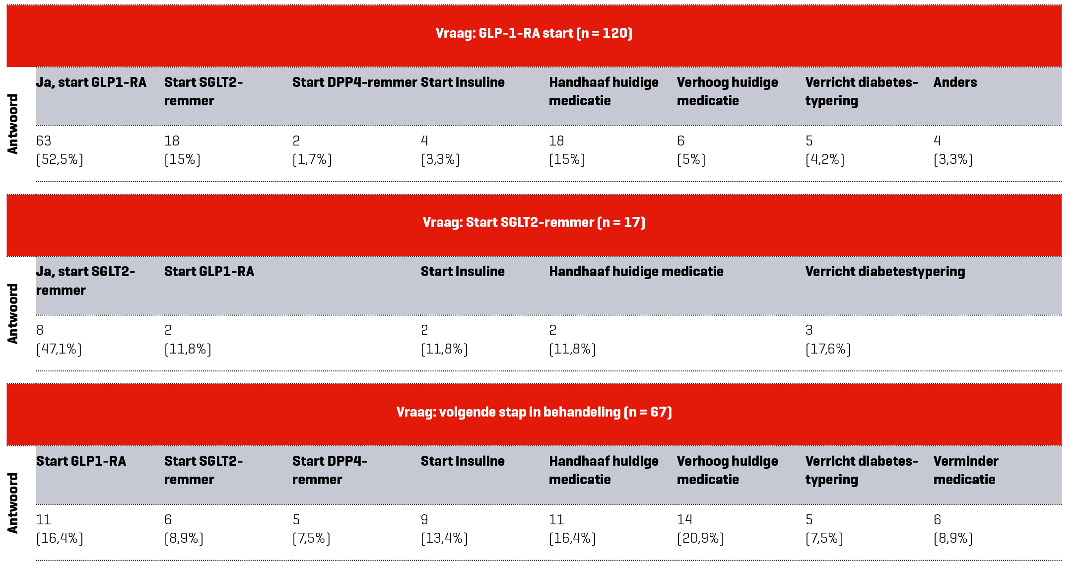 Verreweg de meeste vragen gingen over welke behandeling gestart moest worden bij aanhoudende verhoogde bloedglucosewaarden. In 51% van de consultaties stelde een deelnemer de vraag of starten met een GLP1-receptoragonist (RA) de beste optie was [tabel 1a en 1b]. In bijna de helft van deze consultaties werd afgeraden om hiermee te starten, omdat er een beter alternatief was. Andere vragen betroffen twijfel over het type diabetes, hadden betrekking op de mate van kwetsbaarheid van de patiënt (bijvoorbeeld hoge leeftijd, cognitief functieverlies, taalbarrière), waardoor de standaardbehandeling niet altijd mogelijk was, of er was een te groot verschil tussen het actuele HbA1c en de persoonlijke HbA1c-streefwaarde. In 23% van de casussen werd geadviseerd de medicatie te handhaven of te verminderen, omdat de persoonlijke streefwaarde bereikt was of omdat er sprake was van kwetsbaarheid. In veel gevallen werden er aanvullende adviezen gegeven over leefstijlinterventies en bloeddruk- of cholesterolmedicatie. Ook werd vaak verwezen naar bestaande protocollen/richtlijnen op de website van de zorggroep, zoals het regionaal transmuraal formularium en de praktijkwijzers over SGLT2-remmers of GLP1-RA.
