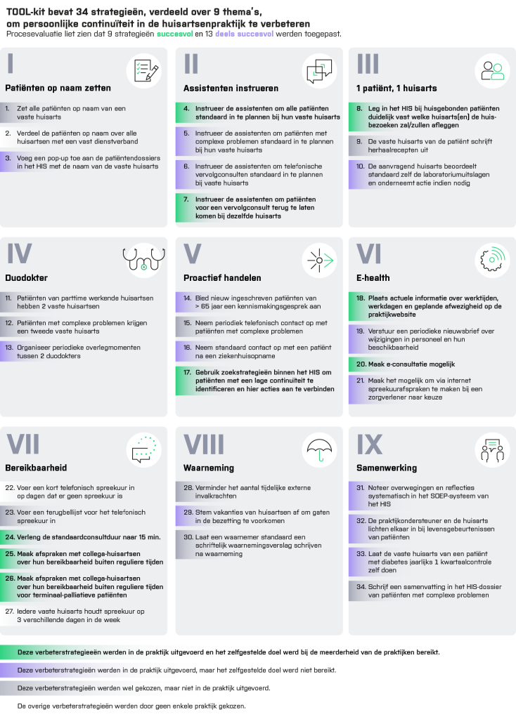 - TOOL-kit bevat 34 verbeterstrategieën voor 9 verschillende thema’s gericht op 1) patiënten op naam zetten, 2) assistenten instrueren, 3) 1 patiënt, 1 huisarts, 4) duodokters, 5) proactief handelen, 6) e-health, 7) bereikbaarheid, 8) waarneming en 9) samenwerking.