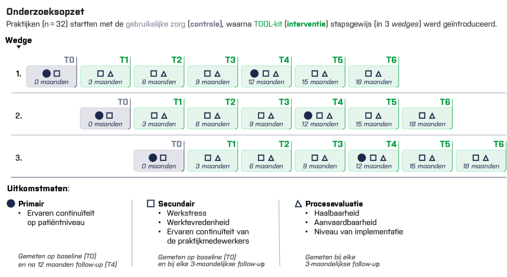 Gedurende 18 maanden verzamelden we gegevens, met meetmomenten aan het begin van de trial (T0) en op 6 momenten met tussenpozen van 3 maanden (T1-T6). De primaire uitkomstmaat maten we op baseline en op 12 maanden (T4) via papieren vragenlijsten die we onder patiënten verspreidden. De secundaire uitkomsten en procesevaluatie werden gedurende de gehele onderzoeksperiode van 18 maanden via digitale enquêtes gemeten op maand 0 en 3-maandelijkse follow-upmomenten.