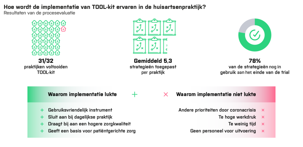 De implementatie van TOOL-kit was deels geslaagd. Van de 34 verbeterstrategieën uit TOOL-kit zijn er 9 succesvol toegepast (figuur 1). Dat wil zeggen dat de meerderheid van de praktijken er in is geslaagd om de verbeterstrategie uit te voeren en hier hun zelfgestelde doelen mee te bereiken. Bij deels succesvolle toepassing (13/34) was de verbeterstrategie deels uitgevoerd, maar was het zelfgestelde doel niet bereikt. Van niet-toegepaste verbeterstrategieën (9/34) werden geen onderdelen in de praktijk uitgevoerd en werd geen resultaat bereikt. De resterende 3 verbeterstrategieën werden door geen enkele praktijk toegepast.