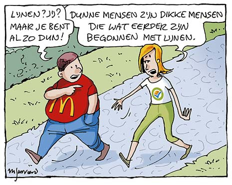 Mensen die willen afvallen, krijgen te maken met twee vormen van terreur. Niet alleen moeten ze voortdurend weerstand bieden aan hoogenergetische verleidingen, ze moeten zich bovendien teweerstellen tegen allerlei onzin en kletspraat. Het lijkt wel of de meelevende omgeving denkt de…