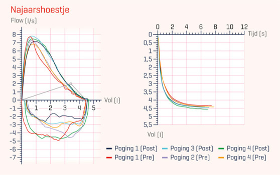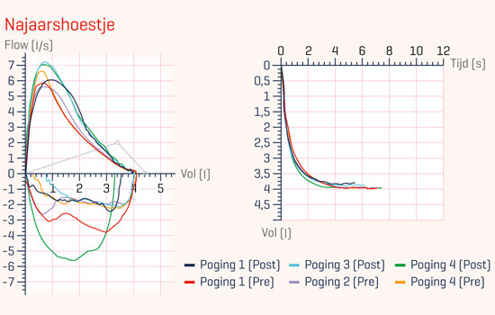 Figuur 2 | Flow-volume- en volume-tijdcurves voor en na het toedienen van salbutamol 6 weken na de vorige spirometrie