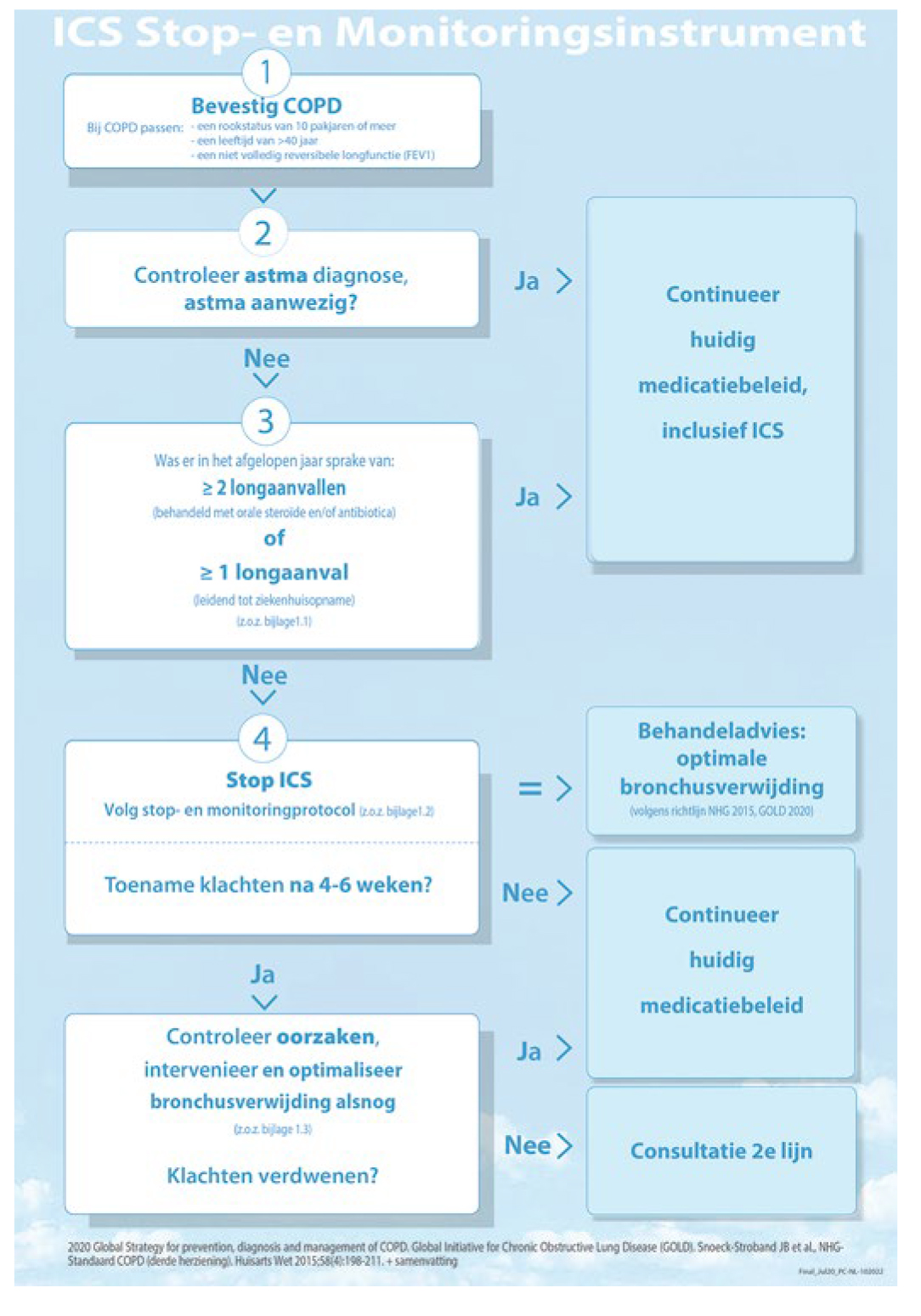 Zestig procent van de COPD-patiënten in Nederland gebruikt een inhalatiecorticosteroïd (ICS). Bij slechts 25% van deze populatie is er sprake van een indicatie. Deze vorm van overbehandeling in Nederland kost 16 miljoen euro op jaarbasis en draagt bovendien bij aan ICS bijwerkingen. Mogelijk biedt het ICS stop- en monitoringsinstrument soelaas bij de aanpak van dit probleem.