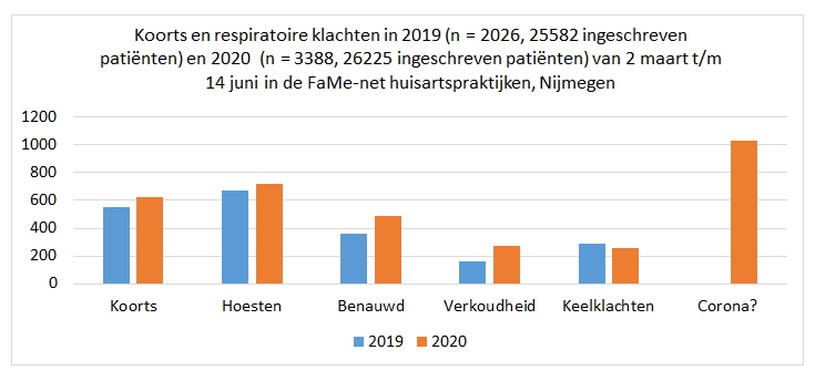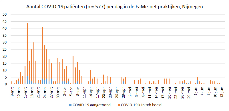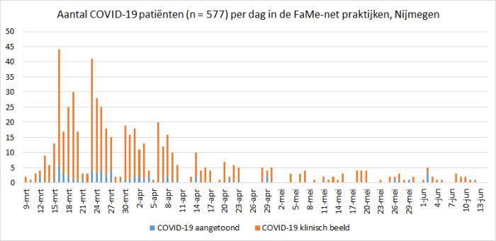 Het Nijmeegse academisch registratienetwerk huisartsgeneeskunde FaMe-net registreert sinds 2 maart de contacten over COVID-19. Uit de cijfers blijkt dat er een forse toename van aan COVID-19 gerelateerde problemen was en een snelle stijging van het aantal nieuwe gevallen. De curve is na de eerste vier weken afgevlakt en er worden in de huisartsenpraktijk nauwelijks meer nieuwe gevallen gezien. Als ze al gezien worden, dan hebben de patiënten vaak al langere tijd klachten. Ook de verdere versoepeling van de overheidsmaatregelen op 1 juni heeft 14 dagen later niet geleid tot een toename van het aantal nieuwe gevallen. De gegevens in deze bijdrage zijn bijgewerkt tot en met 14 juni 2020, en zullen zolang de situatie stabiel is, niet meer wekelijks worden aangevuld. De meest recente gegevens leest u op de website www.famenet.nl.