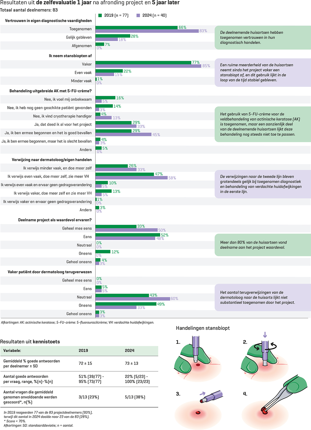 Bij de uitgebreide evaluatie in 2019 bleek dat de zelfevaluatie grotendeels overeenkwam met de geanalyseerde kwantitatieve data (zoals HIS-extracties, analyses van PA-aanvragen en verwijsbrieven). Hieruit bleek ook dat de geschoolde deelnemers aan het project voorafgaand aan een verwijzing vaker al een biopt hadden afgenomen dan de controlegroep. 5 De nieuwe NHG-Standaard Verdachte huidafwijkingen was destijds al beschikbaar. Of dit verschil in 2024 nog steeds bestaat, konden wij niet onderzoeken. Wel is de verwachting dat huisartsen door de gestaag toenemende incidentie van verdachte huidafwijkingen (pre)maligne afwijkingen tegenwoordig vaker tegenkomen. 2 Hopelijk zorgen kruisbestuiving en de bredere bekendheid van de NHG-Standaard ervoor bij dat biopteren een blijvende diagnostische vaardigheid van de huisarts blijft.