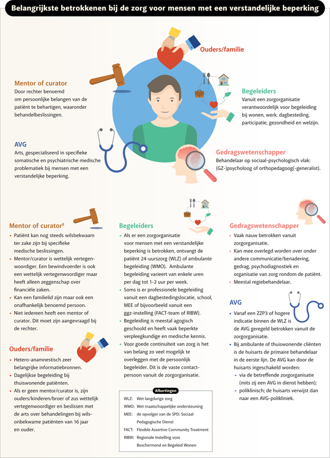 Ongeveer 1% van de Nederlanders heeft een verstandelijke beperking en vrijwel iedere huisarts ziet in de praktijk een aantal patiënten uit deze kwetsbare groep. De communicatie met deze patiënten moet worden aangepast aan het ontwikkelingsniveau, dat per patiënt kan verschillen. Ook kennis van het zorgnetwerk rondom de patiënt is van belang, zodat dit kan worden ingezet bij heteroanamnese en begeleiding. En bij de diagnostiek en behandeling helpt het op de hoogte te zijn van veelvoorkomende medische problematiek bij deze groep. Voor de bijkomende medische, psychische en sociale problemen die patiënten met een verstandelijke beperking vaak hebben, kan worden verwezen naar een arts voor verstandelijk gehandicapten (AVG).