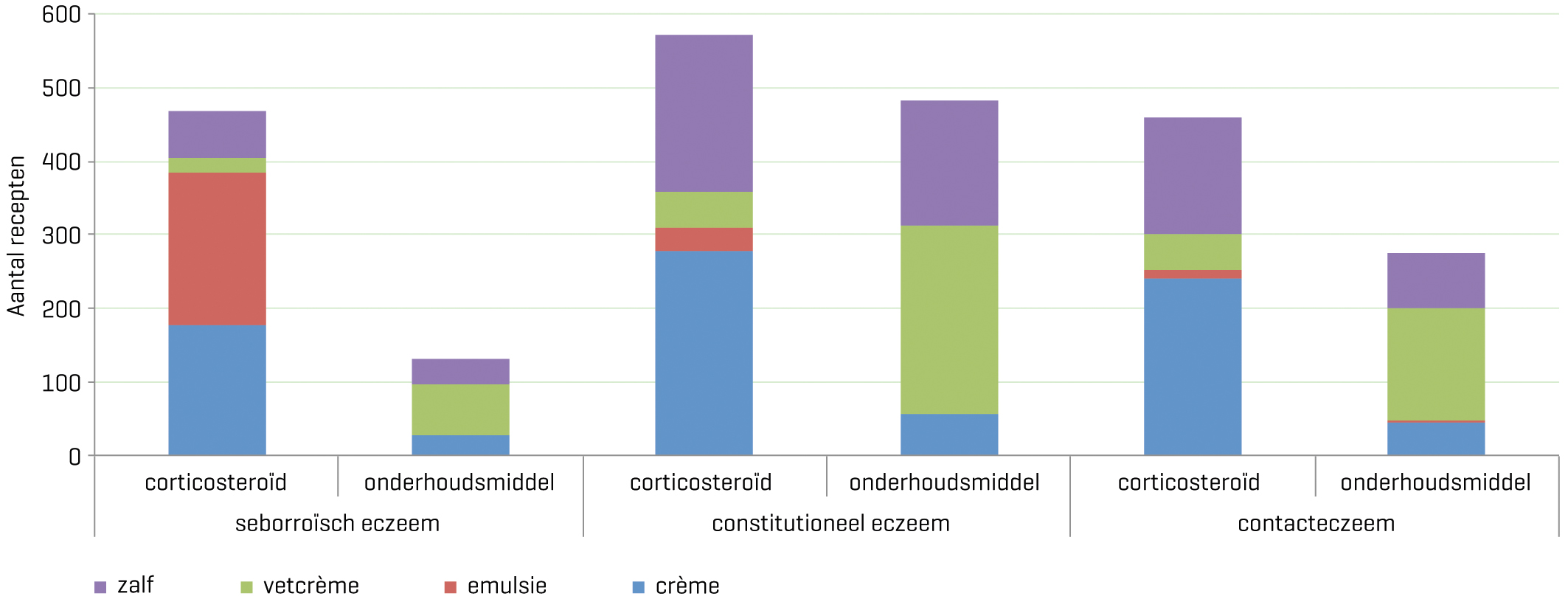 De richtlijnen adviseren eczeem in de acute fase te behandelen met lokale corticosteroïden en als onderhoudstherapie een crème of zalf te gebruiken. Een vettere substantie (vetcrème of zalf) beschermt de huid effectiever en bevordert de opname van steroïden, maar de richtlijnen benoemen deze voorkeur niet expliciet. Bakker et all. onderzochten voor verschillende soorten eczeem welke middelen en substanties huisartsen voorschrijven, en welke langetermijnstrategieën zij daarbij volgen.