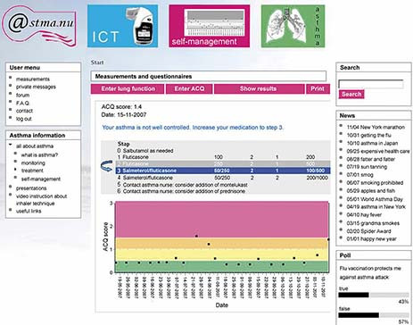 Zelfmanagementondersteuning via internet verbetert de astmagerelateerde kwaliteit van leven, de astmacontrole, de longfunctie en het aantal symptoomvrije dagen, vergeleken met de gebruikelijke zorg.