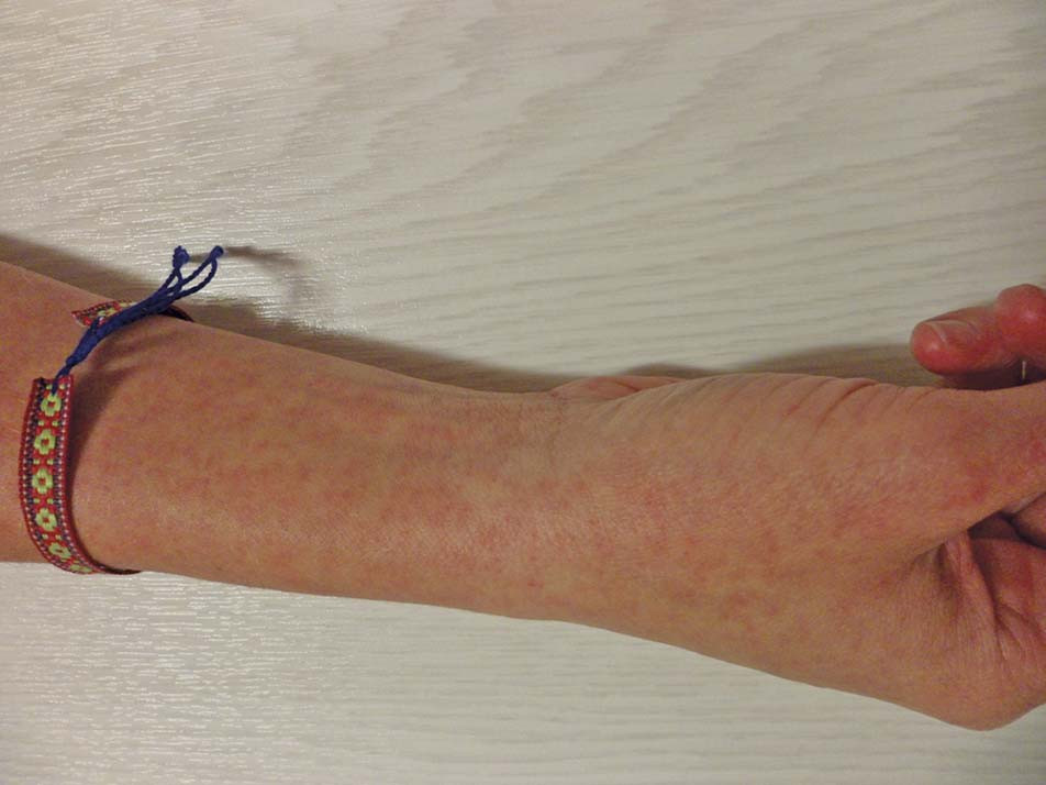 Een 35-jarige vrouw krijgt vijf dagen na een vakantie in Suriname last van extreme vermoeidheid en lymfadenopathie in de hals. Een dag later ontstaat er een rash op het gelaat en de romp die zich snel uitbreidt over haar gehele lichaam. Er is sprake van een niet-pussende conjunctivitis…