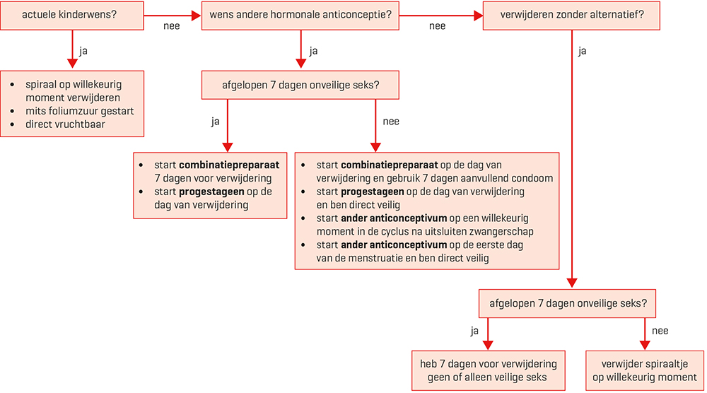 Het plaatsen van een intra-uterine device (IUD oftewel spiraaltje) tijdens een onttrekkingsbloeding biedt geen garantie dat de vrouw niet zwanger is. Ga daarom altijd na of iemand in de periode voor de plaatsing wel correcte anticonceptie heeft toegepast. Bij verwijdering van het IUD moet de vrouw het advies krijgen in de week ervoor geen of alleen veilige seks te hebben.