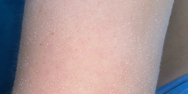 Een 24-jarige gezonde vrouw stuurt via een e-consult foto’s van haar huid. De afgelopen weken heeft zij, vooral na sporten of inspanning, een huiduitslag op de romp, armen en benen. De witte blaasjes verdwijnen binnen enkele uren weer en verschijnen telkens op andere plekken. De jeuk is mild. Ze is niet bekend met allergieën en gebruikt geen medicatie. De huid voelt wat ruw aan en ze heeft dit nooit eerder gehad.