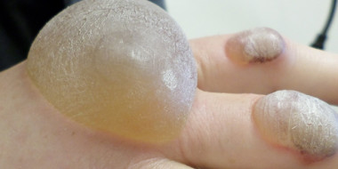 Een 49-jarige vrouw bezoekt het spreekuur van de huisarts, omdat er blaren zijn ontstaan op beide handen. Zij heeft hypertensie, waarvoor zij metoprolol retard 50 mg per dag gebruikt. De week ervoor heeft de doktersassistente wratjes op haar handen en neus aangestipt. Ze heeft geen pijn, maar de huid voelt wel strak aan. Mevrouw voelt zich niet ziek en heeft geen koorts.