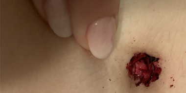 Een 42-jarige vrouw heeft voor de tweede keer in haar leven tijdens de menstruatie bloedverlies uit een 4 mm grote zwelling in de navel. Het gaat om een rode, nattende, makkelijk bloedende papel. De zwelling is niet pijnlijk en produceert een druppeltje bloed terwijl arts en patiënt in gesprek zijn. De patiënte had eerder een zwelling in het linker labium majus die bleek te berusten op een ophoping van oud bloed.