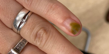 Een vrouw van 33 met in de voorgeschiedenis mammacarcinoom meldt zich bij de huisarts met nagelafwijkingen. Door de chemotherapie die zij moest ondergaan had zij brokkelige – en, in haar ogen, lelijke – nagels gekregen, waarvoor zij acrylnagels had laten plaatsen. Na 3 weken kwam ze bij de nagelstylist terug en was de afwijking op bijgaande foto te zien. Zij had geen jeuk of pijn.
