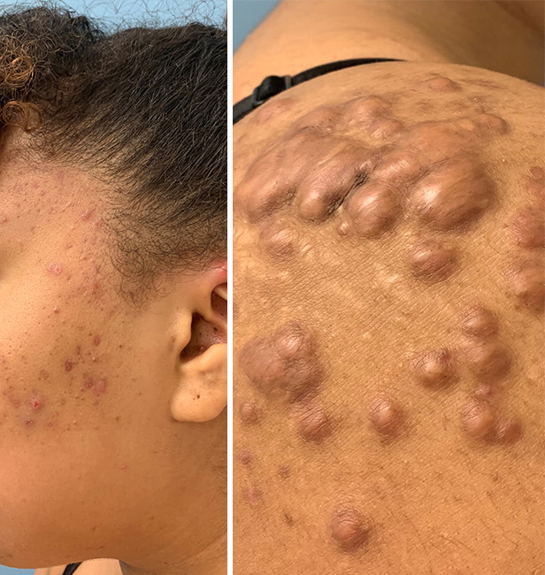 De huisarts verwijst een 16-jarig meisje naar de dermatoloog in verband met cosmetisch storende littekens op haar schouders en borst. Bij lichamelijk onderzoek zijn er naast het keloïd op haar schouders en borst ook huidafwijkingen zichtbaar in het gelaat.