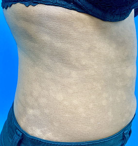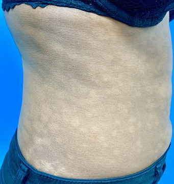 Een 27-jarige vrouw komt op het spreekuur met lichte vlekken op de voor- en achterzijde van de romp. De vlekken geven geen klachten en jeuken ook niet, maar zij vindt ze niet mooi. De patiënte had geen andere huidafwijkingen voordat ze deze lichte vlekken kreeg. Behandeling met ketoconazolcrème had geen effect. De tangentiële trektest (bij het straktrekken (uitrekken) van de huid ontstaat er in de witte vlekken een fijne schilfering) is negatief. De algemene voorgeschiedenis vermeldt geen bijzonderheden.