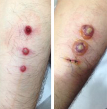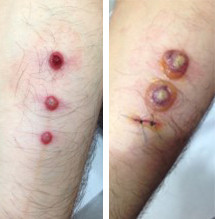 Een 35-jarige man had op de arm mooi in lijn drie afwijkingen, die de huisarts nog nooit gezien had. De afwijkingen waren ontstaan na een vakantie in Turkije. De man voelt zich niet ziek en had geen koorts. Via teledermatologie kwam de respons: ‘Advies: neem een biopt.’ Een controle na een week liet een veranderd beeld zien.