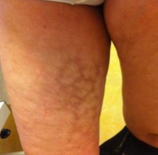 Een 65-jarige vrouw heeft plekken op haar benen.
