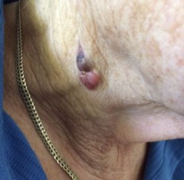 Een 92-jarige vrouw heeft al jaren een verheven naevus in de hals.
